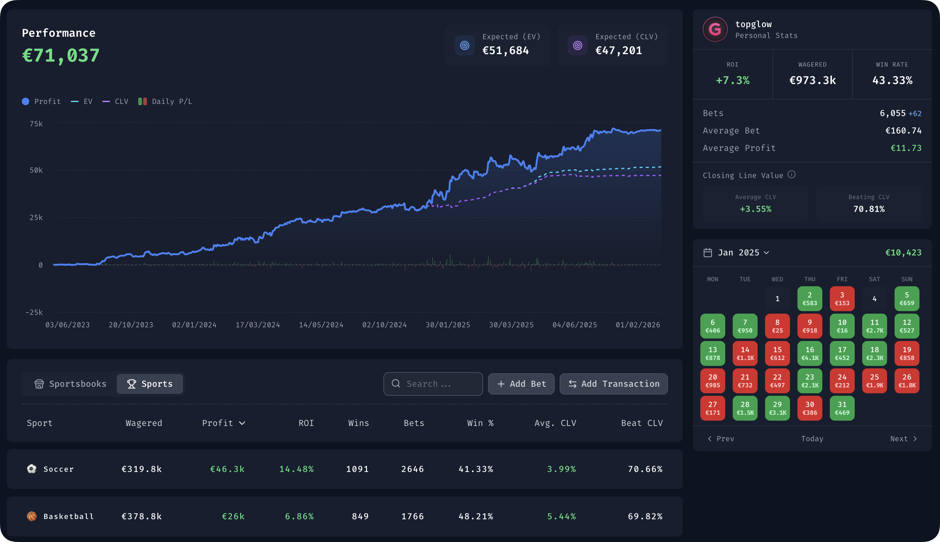 The integration with our value bet scanner is the key advantage. When you find a +EV opportunity, you can track it with one click. The closing line is recorded automatically, so you always know your true CLV without extra work.